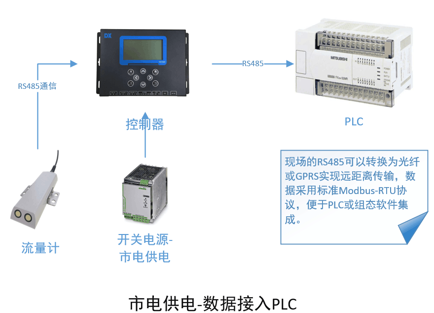 DX-LSX-1多普勒超聲波流量計(jì)通過RS485接入到DX100C通用型數(shù)字控制器上,控制器采用12V直流開關(guān)電源供電,控制器輸出RS485給PLC?,F(xiàn)場的RS485可以轉(zhuǎn)換為光纖或GPRS實(shí)現(xiàn)遠(yuǎn)距離傳輸,數(shù)據(jù)采用標(biāo)準(zhǔn)的Modbus-RTU協(xié)議,便于PLC或組態(tài)軟件集成。